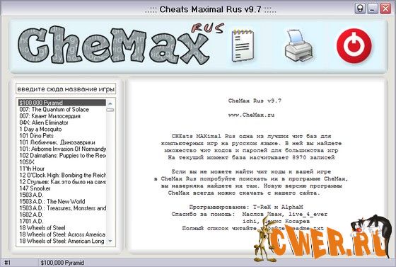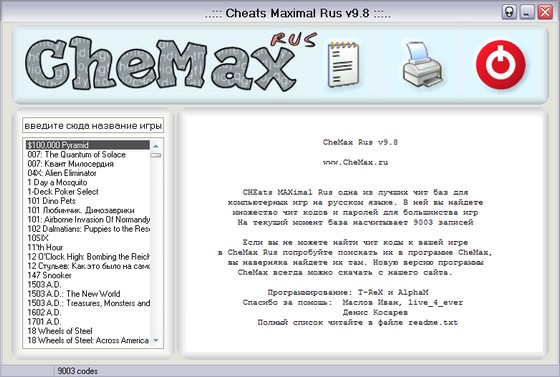 CheMax - наибольшая из известных на данный момент программ, которые являют собой базу данных с кодами для игр. Простой и красивый интерфейс, малый размер, и при этом огромное количество представленных игр. Особенностью базы является отсутствие в ней хинтов и прочей “отсебятины“, вашему вниманию представлены только коды (cheats, hex-cheats) и пароли (passwords).