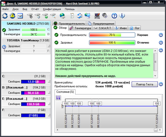 HD Tune Pro - программа для планомерного детального тестирования текущей работоспособности и производительности жестких дисков с различными интерфейсами (SCSI, SATA или IDE), а так же карт памяти и flash-дисков. Программа производит замер и наглядно отображает такие параметры накопителей, как скорость передачи данных, время чтения, записи и время доступа, уровень загрузки процессора, температуру винчестера, показывает в виде сводной таблицы данные поставляемые S.M.A.R.T, позволяет сканировать жесткие диски и другие накопители на предмет наличия ошибок, выдает информацию о версии firmware, серийном номере, объеме диска и подробности по потребителям полезной площади, его КЭШа, возможном и активном режимах передачи данных и т д. и т.п.