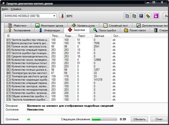 CrystalDiskInfo - отслеживает состояние жестких дисков, поддерживающих технологию S.M.A.R.T. Производит мониторинг и дает общую оценку "здоровья" вашего диска. Так же отображает детальную информацию о жестких дисках, установленных в компьютере (прошивка, серийный номер, стандарт, интерфейс, общее время работы и др.), а также выводит параметры атрибутов системы самодиагностики S.M.A.R.T. (ошибки чтения, производительность, запуски/остановки шпинделя, время поиска дорожки, количество циклов включения-выключения, ошибки секторов и многое другое).