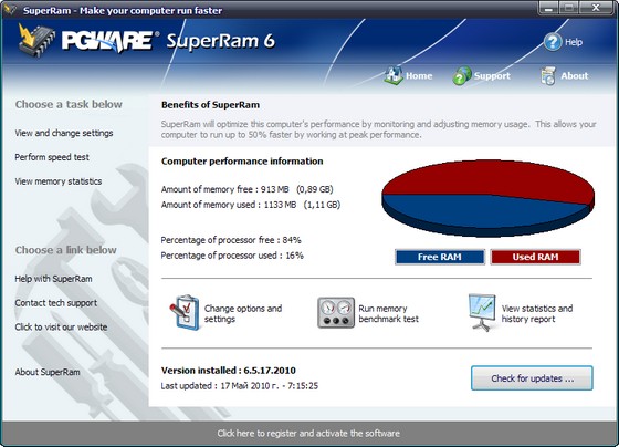 SuperRam - это инструмент для оптимизации и управления компьютерной памятью. Работать с программой просто - с ней справится даже человек, никогда раньше не работавший с подобными утилитами. Вам будет достаточно выбрать объем памяти, который будет использоваться, и объем, который следует освободить, после чего нажать кнопку "ОК". Остальное сделает SuperRam.