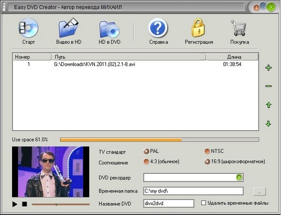 Easy DVD Creator - простой и удобный инструмент для конвертирования AVI/DIVX/XVID/DIV, MPEG/MPG/DAT, WMV/ASF/ASX, RM/RMVB, MOV/QT, 3GP/3G2, MP4/M4V, и FLV в DVD, которые вы сможете посмотреть на обычном домашнем DVD-плейере. С помощью Easy DVD Creator вы сможете превратить фильмы о ваших путешествиях, свадьбах, домашних торжествах в DVD, которые можно показать друзьям и семье! Просто добавьте видео-файлы в список файлов конвертера и нажмите кнопку “Start”.