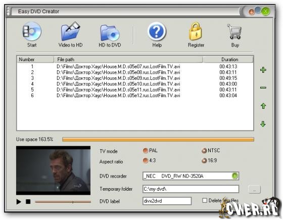 Easy DVD Creator - простой и удобный инструмент для конвертирования AVI/DIVX/XVID/DIV, MPEG/MPG/DAT, WMV/ASF/ASX, RM/RMVB, MOV/QT, 3GP/3G2, MP4/M4V, и FLV в DVD, которые вы сможете посмотреть на обычном домашнем DVD-плейере. С помощью Easy DVD Creator вы сможете превратить фильмы о ваших путешествиях, свадьбах, домашних торжествах в DVD, которые можно показать друзьям и семье! Просто добавьте видео-файлы в список файлов конвертера и нажмите кнопку "Start".