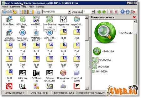Программа для поиска, извлечения и сохранения иконок из файлов. Icon Searcher производит поиск иконок по всему жесткому диску или выборочно. Утилита читает форматы DLL, EXE, ICO, ICL, OCX, SCR, CPL, BPL, VBX, DRV и извлекает из файлов все доступные иконки. Программа помещает найденные иконки в собственную базу данных и может сохранить иконки в следующих форматах: BMP, ICO, JPG, GIF, PNG, PCX, TGA и TIFF. Есть возможность загрузки дополнительных коллекций иконок с сайта программы.