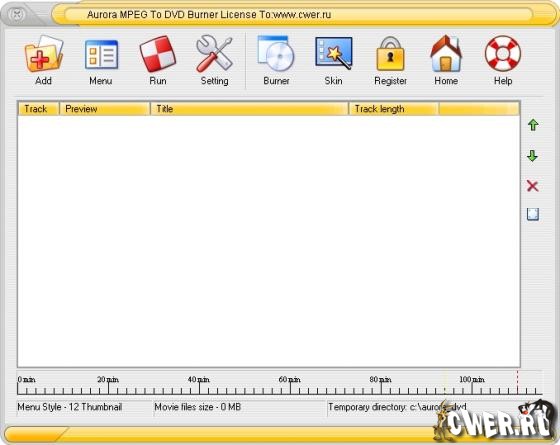 Aurora MPEG To DVD Burner - предназначена для записи MPEG файлов на DVD-R, DVD+R, DVD+RW, DVD-RW, VCD-R диски, для последующего просмотра на DVD-плеере. Кроме того, программа позволяет создавать структуру DVD диска, меню, с выбором всех настроек (меню, цвет, фон, шрифт и т.д.), копировать DVD или его структуру в ISO образ.