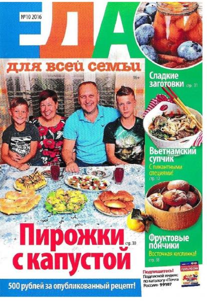 "Еда для всей семьи" - это не только красочное издание, ценная кулинарная информация, но еще и приятное, увлекательное чтение, где за каждым рецептом - не выдуманная история его создания, реальный автор. Кроме того, забавные кулинарные байки, советы опытных поваров, кулинарные приметы и сонники. Отличный кулинарный журнал, в котором можно найти блюда на любые случаи жизни. Он поможет приготовиться к приему гостей и удивить их. Здесь собраны кулинарные советы, информация о полезных продуктах и здоровом питании.