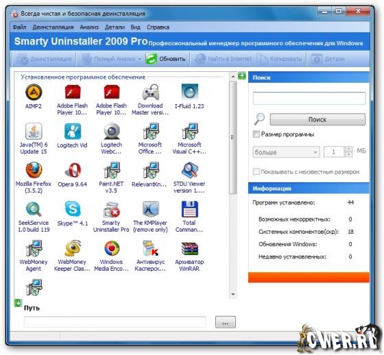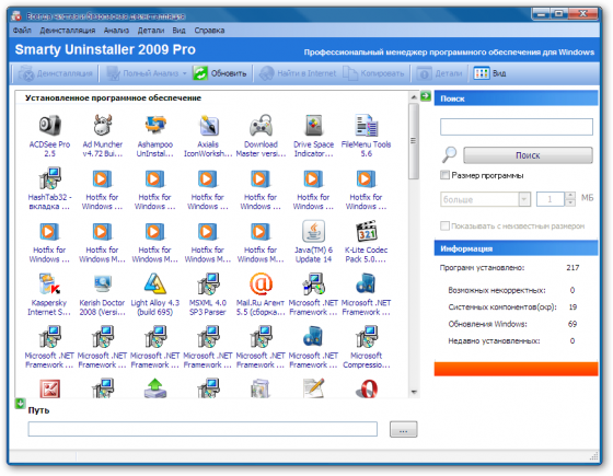 Smarty Uninstaller 2009 - Обеспечивает решение задач по деинсталляции приложений, установленных на вашем компьютере. Он служит заменой стандартному диалогу Добавить/Удалить программу Windows . При этом работает приблизительно в 5-10 раз быстрее. Может показывать соответствующие значки приложений. Имеется функция поиска приложения по ключевому слову.