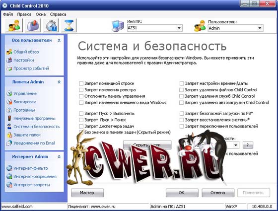 Salfeld Child Control - программа ограничивает время, проводимое вашими детьми за компьютером, как только выделенное им время закончится, компьютер автоматически выключится и повторный вход будет возможен только после ввода пароля. Ограничение можно ввести как по общему времени (например, не более 1 часа в день), так и по периоду времени, когда можно работать (например, с 22:00 до 8:00 доступ запрещен). Кроме этого, программа позволяет запретить посещение нежелательных сайтов, а также заблокировать доступ к определенным дискам и папкам.