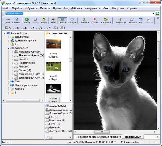 xplorer² - достаточно функциональный файловый менеджер. Интерфейс программы похож на стандартный Проводник Windows, но из-за дополнительных кнопок и панелей возможности этого менеджера намного обширнее, чем у Проводника. Для работы с файлами и директориями на локальном компьютере тут имеются все необходимые опции (копирование, перемещение, удаление, поиск, фильтрация, просмотр по заданным параметрам и т.д.). Поддерживается работа с сетевыми дисками, причём, в подключённых сетевых дисках при необходимости происходит автоматическое обновление файлов. Программа может работать как с отдельно взятыми файлами, так и с файлами в пакетном режиме.