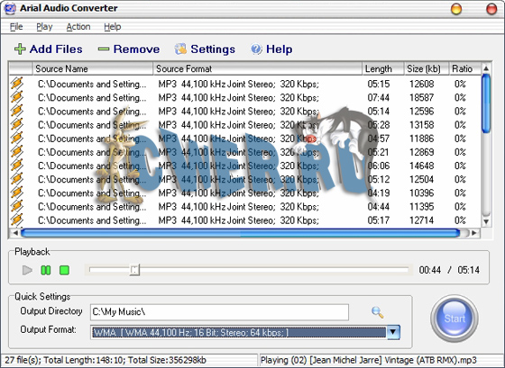Arial Audio Converter - профессиональная версия аудио-конвертера, способного конвертировать большинство аудиоформатов: MP3, WMA, OGG, MP2, WAV (PCM, DSP, GSM, ADPCM ), G721, G723, G726, VOX, ALAW, ULAW. Конвертация происходит напрямую, без создания промежуточных файлов, что обеспечивает экономию места на диске и высокую скорость работы. Имеется возможность обработки группы файлов.