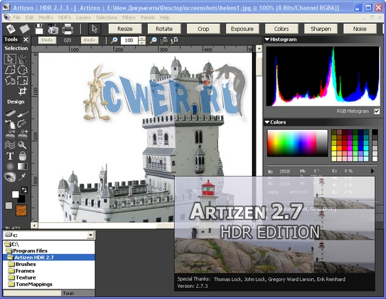 Artizen HDR - мощный графический фоторедактор для обработки цифровых снимков. В первую очередь Artizen HDR позиционируется, как графический редактор для работы с форматами цифровых фотографий: JPEG, RAW (Digital Camera RAW) и HDR (High Dynamic Range). Однако, поддерживаются несомненно и другие форматы, полный список поддерживаемых форматов выглядит так: ARTI, ATX, BMP, DIB, OpenEXR, EMF, GIF, HDR, ICB, ICO, JPG, JFIF, JPE, JPEG, PBM, PCD, PCX, PFM, PGM, PNG, PPM, PSD, PSP, RLE, SGI, TGA, TIF, TIFF, VDA, VST, WBMP, WMF. В том, числе даже, как редактор иконок может выступать эта программа.