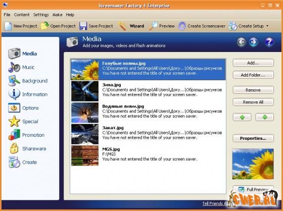 Программа дя создания скринсейверов для себя, для рекламы и для коммерческого использования. Вы можете создавать скринсейверы из набора картинок, видео или флеш-анимации, с добавлением фоновой музыки и более 150 эффектов перехода. Screensaver Factory очень прост в использовании, он позволяет вам создавать самостоятельные самоинсталлирующиеся скринсейверы и CD для простой установки и распространения.
