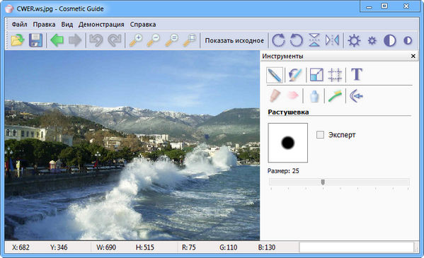 Cosmetic Guide - программа для удаления косметических дефектов непосредственно на фотографиях. Поможет разгладить морщины, отеки или припухлости; удалить родимые пятна и бородавки; избавиться от второго подбородка; отбелить зубы. В программе есть демонстрационные примеры, показывающие работу с инструментами.