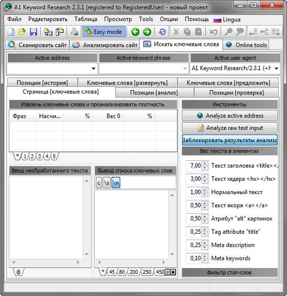 A1 Keyword Research — программа позволяющая проанализировать Ваш сайт и подобрать для него наиболее подходящие ключевые слова, используемые в поисковых системах. Данный исследовательский инструмент позволяет проанализировать сайты Ваших конкурентов, предложит ключевые слова для Вашего сайта, проверит позиции сайта в поисковых системах, увеличит списки ключевых слов Вашего сайта и поможет оптимизировать страницы на плотность и известность ключевых слов.
