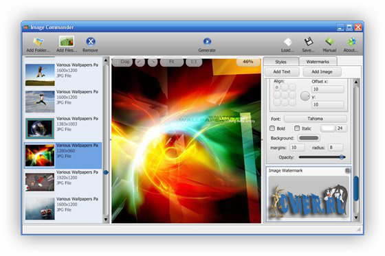 Binerus Image Commander - программа, с помощью которой можно вставить в графическое изображение любой текст, водной знак, логотип или иную метку, например для защиты авторских прав. Программа также поможет подготовить коллекцию изображений для публикации в интернете, подогнав изображения по размеру, повернув нужные картинки для правильного отображения и добавив некоторые эффекты. Поддерживается пакетная обработка файлов в форматах BMP, JPG, GIF, PNG, TIFF и PSD.