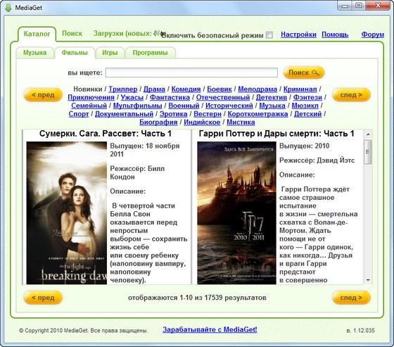 MediaGet - утилита для поиска и скачивания медиафайлов на открытых торрент-трекерах. Каждый человек, пользующийся интернетом, привык скачивать из сети различную музыку, фильмы или игры напрямую с сервера. Но бывают ситуации, когда на любимом сайте искомый файл отсутствует по каким-либо причинам... В этих случаях на помощь приходит замечательный сервис MediaGet, который откроет вам доступ в мир закрытых пиринговых сетей, в которых возможно найти практически любой нужный вам файл. Будь то редкая музыка, недавно вышедший фильм или любая программа - всё это можно скачать с помощью MediaGet. Программа поддерживает огромное количество открытых торрент-трекеров, вы без труда найдете нужный вам файл и скачаете на максимальной скорости.