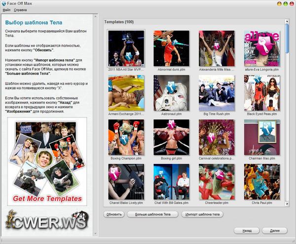 Face Off Max - программа поможет Вам сделать забавное фото, наложив свое или чье-то лицо на чужую фотографию. Разве вы ни когда-нибудь задумывались, как вы будете выглядеть имея другое тело? Не хотелось бы иметь фотографию с группой знаменитостей или на обложке журнала? Теперь Face Off Max позволит вам сделать это и позабавить своих коллег, друзей. Face Off Max имеет простой и удобный интерфейс, инструкции и сотни фантастических шаблонов что позволит любому стать профессиональным художником.