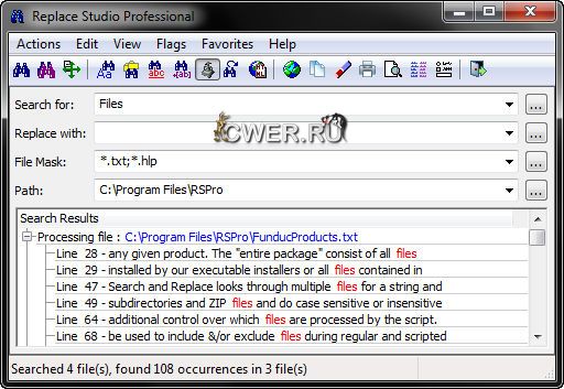 Search and Replace — утилита для поиска и замены информации в текстовых файлах. Программа позволяет производить поиск и замену одной или нескольких строк в нескольких текстовых файлах, включая файлы в Zip архивах. Все операции могут быть выполнены с использованием простого поиска и замены, регулярных выражений или скриптов. После запуска Search and Replace вам нужно ввести поисковый запрос и текст, на который хотите заменить найденные слова. Далее указываете типы файлов и директорию, в которой хотите произвести поиск и замену текста в файлах. Программа пользуется популярностью у программистов, вебмастеров и других пользователей — ведь с ней так просто производить поиск и менять строки в файлах.
