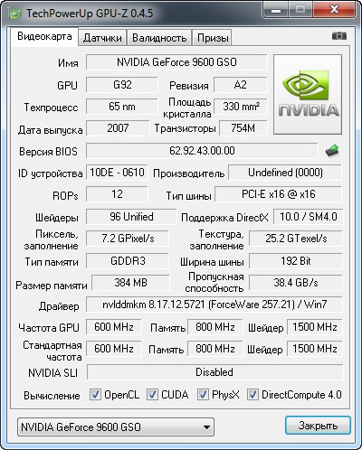 Вышла новая версия программы для вывода информации о графическом адаптере. GPU-Z поддерживает и карты NVIDIA, и ATI. Она поможет определить, какая у вас модель видеокарты, узнать интерфейс подключения, расскажет о том, какой используется графический процессор (версия BIOS, номер ревизии чипа, частота в 2D, 3D-режимах и при разгоне, сведения о поддержке DirectX).
